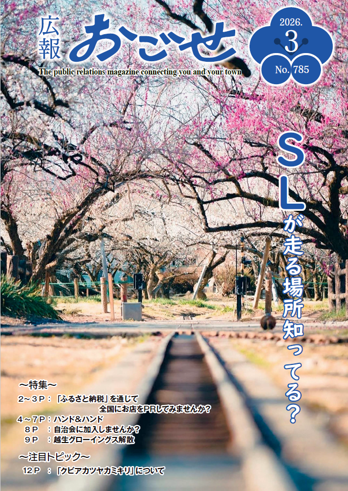 サイト内検索 注目キーワード 令和8年越生梅林梅まつり 武蔵越生七福神めぐり 黒山三滝(くろやまさんたき) 空き家情報 イベントカレンダー もしものとき 新着情報 イベント情報 新着情報 現在、新着情報はありません 新着情報一覧を見る イベント情報 現在、イベント情報はありません イベント情報一覧を見る 場面別で探す Search by Situation 妊娠・出産・子育て 結婚・離婚 引越し 就職・退職 おくやみ 健康・医療 高齢者・介護 事業者向け(企業誘致等) 便利なサービス Convenient Service 税金 保険・年金 戸籍・住民票・印鑑証明 募集情報 申請書ダウンロード イベント 施設 手続きガイド 条例・例規集 東武越生線 JR八高線 路線バス トピックス Topics スライドを再生 スライドを停止 越生町について About Ogose Town 町の概要 町長の部屋 越生町議会 越生町教育委員会・公民館 役場・窓口案内 越生町立図書館 パブリックコメント 広報おごせ 最新号 バックナンバー 公式SNS LINE X(旧Twitter) Instagram 関連リンク 広告 広告募集について ※バナー広告やリンク先の内容については、町が保証するものではありません。