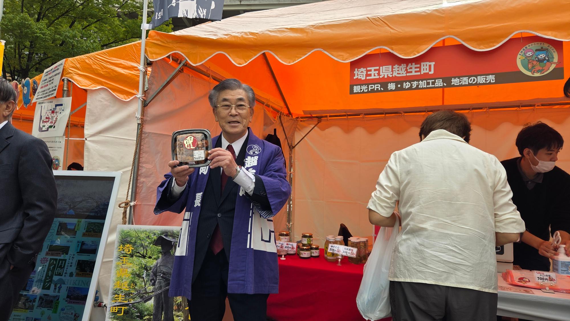 また、越生町を紹介し、特産品を販売するブースも設けていただきましたので、「越生べに梅」の梅干しや元気百梅、ゆず之介も宣伝して販売し、観光のピーアールもしてきました。