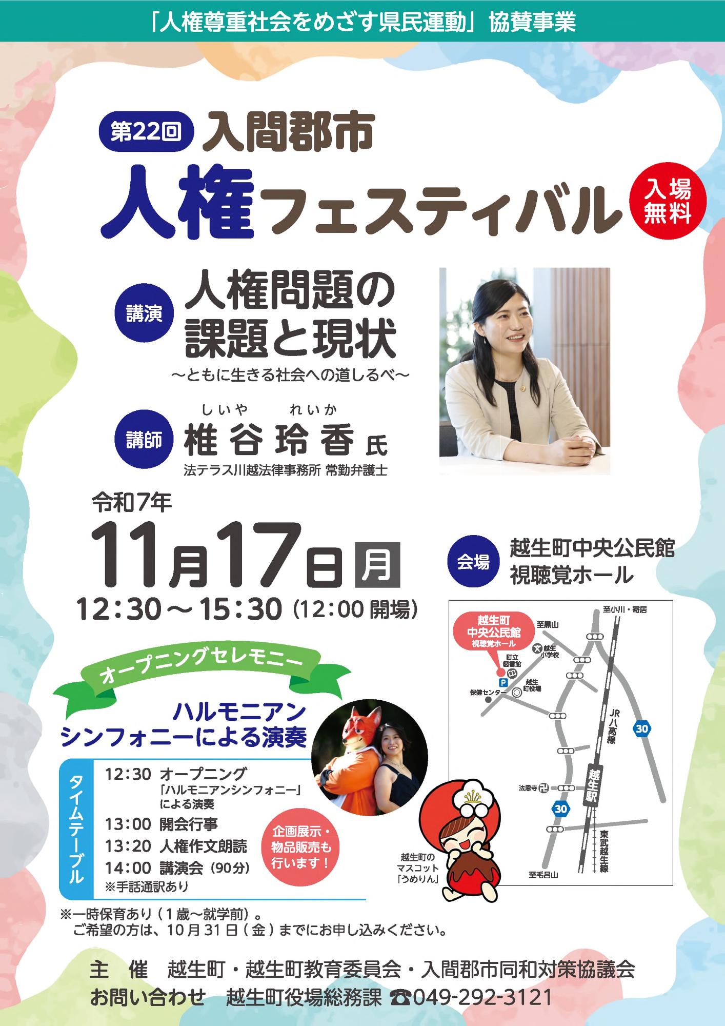 21世紀は、「人権の世紀」といわれるように、人権尊重の意識の高まりは世界的な潮流となっています。人権が尊重され、誰もが自分らしくいきいきと暮らせる社会を実現するためには、一人ひとりが日常生活におけるさまざまな問題を人権の視点で見つめお互いを尊重しあうよう心がけることが大切です。広く地域住民の人権問題への理解・関心を深めることを目的として、「入間郡市人権フェスティバル」を開催します。